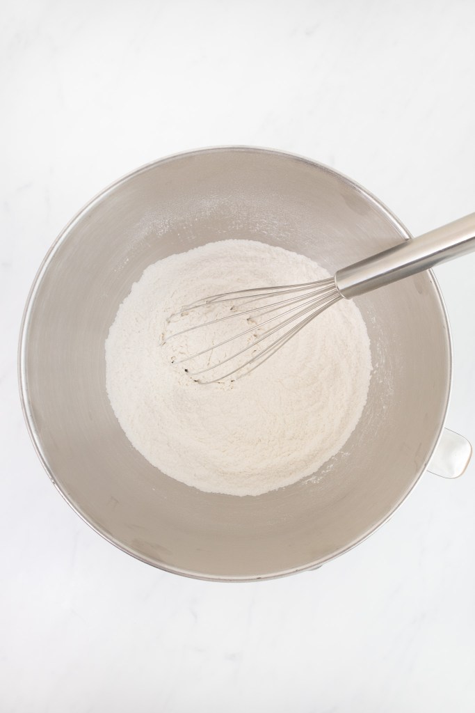 In the bowl of a stand mixer fitted with the paddle attachment (or in a large bowl, if making by hand), whisk together the flour, baking powder, baking soda, kosher salt, and sugar.