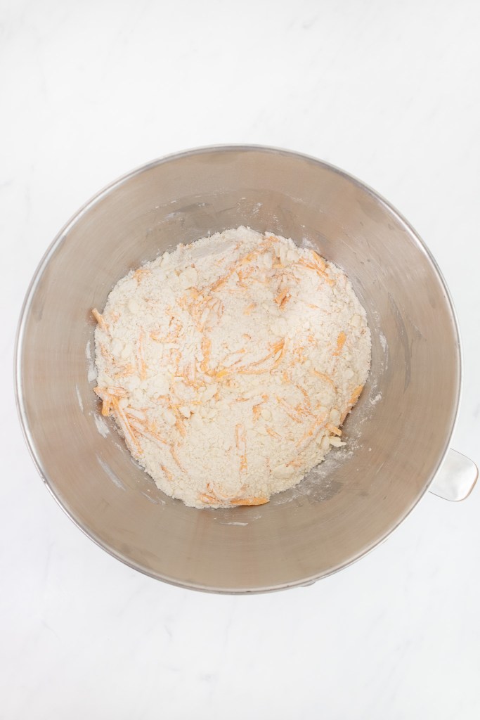 With the mixer at a low speed, add in the cubed butter and allow to mix for 5 to 8 minutes, until only pea-sized pieces of butter remain. Alternatively, if mixing by hand, you can roll the butter and flour between the tips of your fingers.