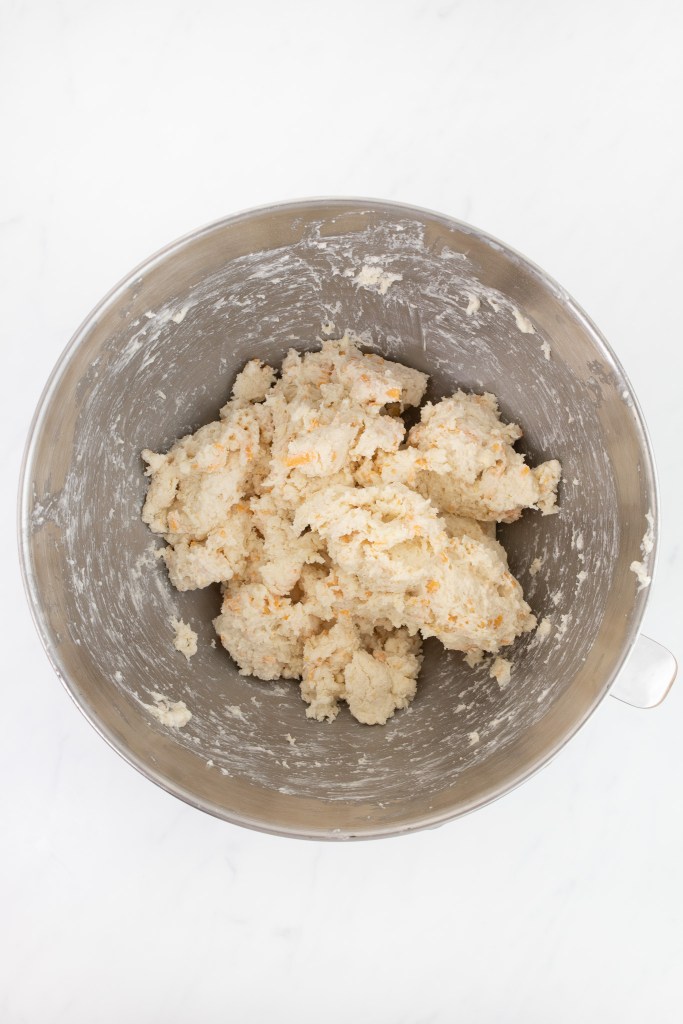 Pour in the buttermilk, and continue to mix at a low speed just until the dough comes together. The dough should be quite moist with no dry patches. If you have any dry patches, remove the bowl from your mixer and add in an additional 1 to 3 Tablespoons of buttermilk, while folding the dough by hand with a rubber spatula or wooden spoon.