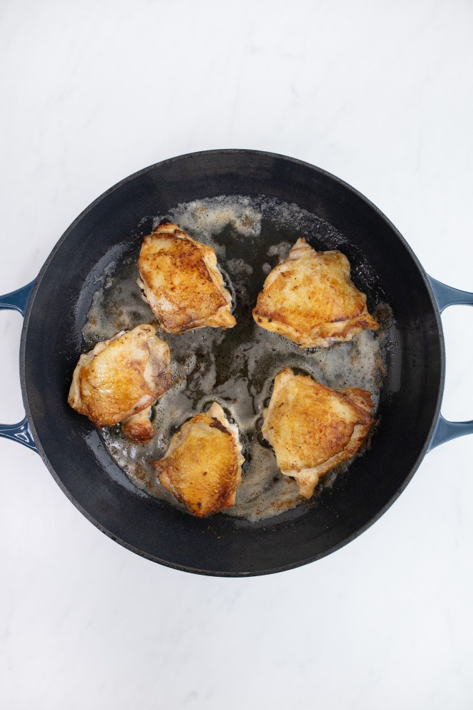 Cook the chicken for 3 to 5 minutes on each side until nicely browned. You may need to brown the chicken in two batches, depending on the size of your pan or Dutch oven: crowding the pan will prevent proper browning. Note that the chicken will not be fully cooked, just browned.
