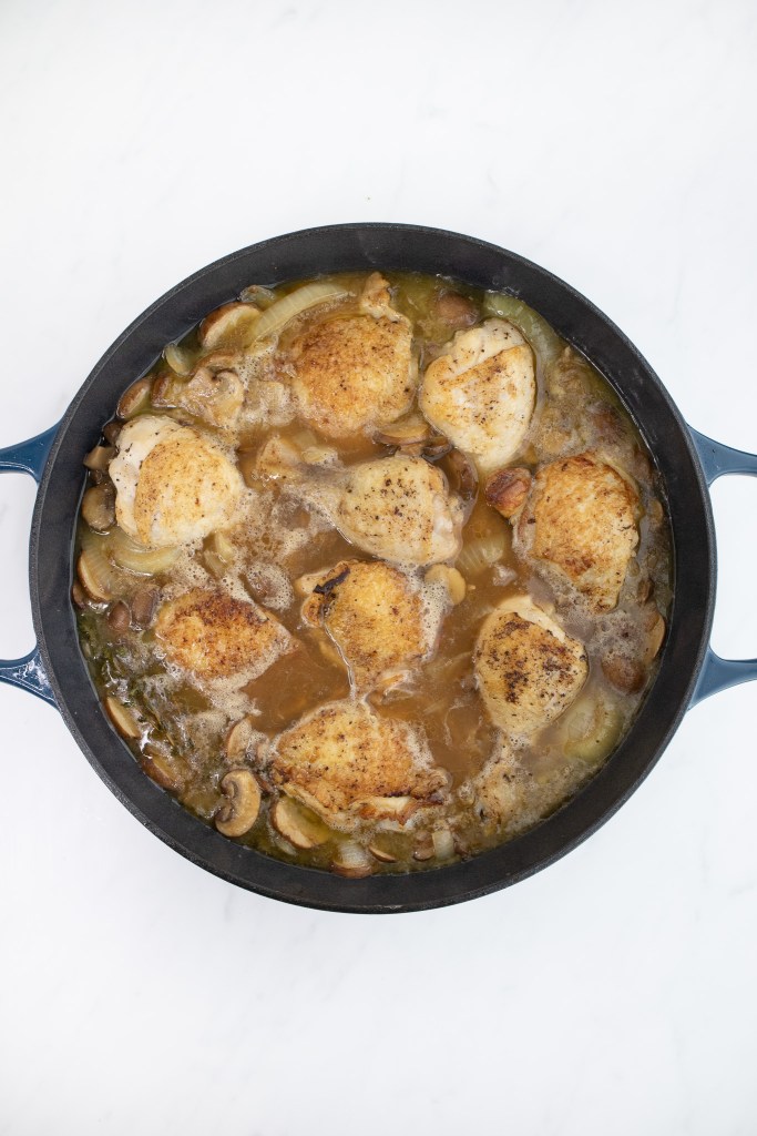Add in the browned chicken and any additional chicken stock, as necessary, so that the cooking liquid covers at least ⅔ of the way up the chicken.