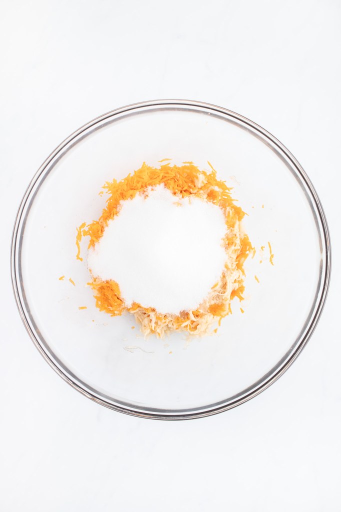 In a large bowl, add in the grated carrots, the grated potatoes/baking soda mixture, and the sugar. Mix with a spoon until combined.