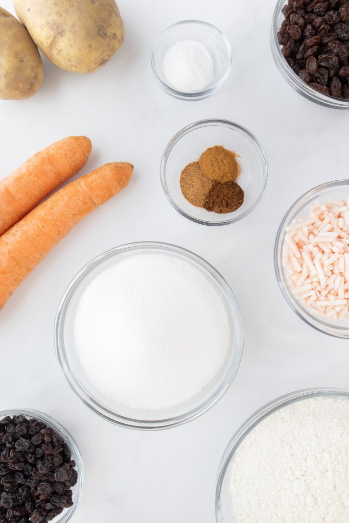 - Order of Mixing Ingredients: I recommend first mixing the baking soda with the grated potatoes, then adding in the grated carrots, the sugar, the flour-coated raisins and currants, the suet, and the flour/spice mixture, in that order, ensuring that each new ingredient is well incorporated before moving onto the next!