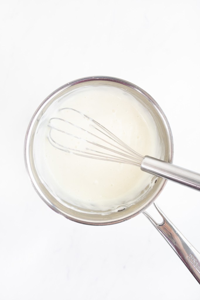 - In a small saucepan, add in ¼ cup of flour. Slowly pour in milk, whisking constantly, until smooth.1 ¼ cup whole milk