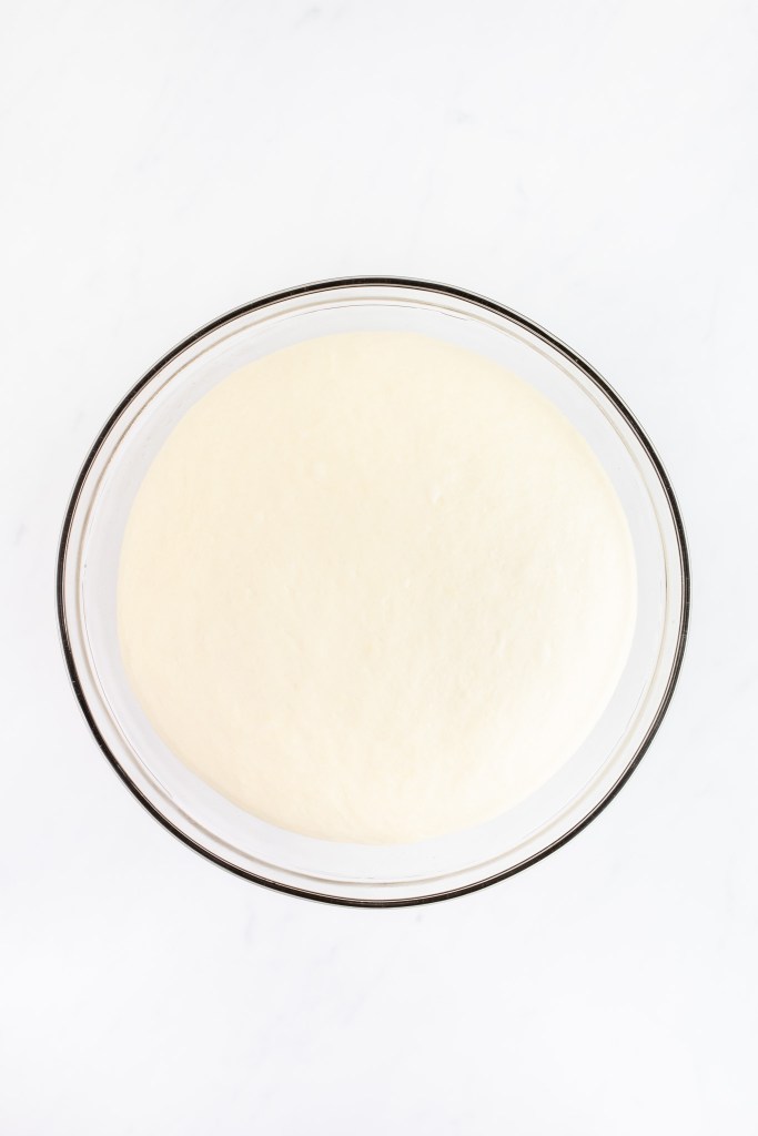 - Pour the dough onto a lightly floured surface and knead it into a smooth ball. Place the ball of dough into a large bowl greased with melted butter. Cover with a damp kitchen towel or plastic wrap and set in a warm place. Allow the dough to rise until doubled in volume (about 90 to 120 minutes).