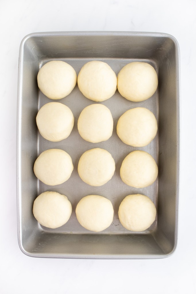 To form the rolls, start by greasing a 9” by 13” baking pan with remaining melted butter and set aside.