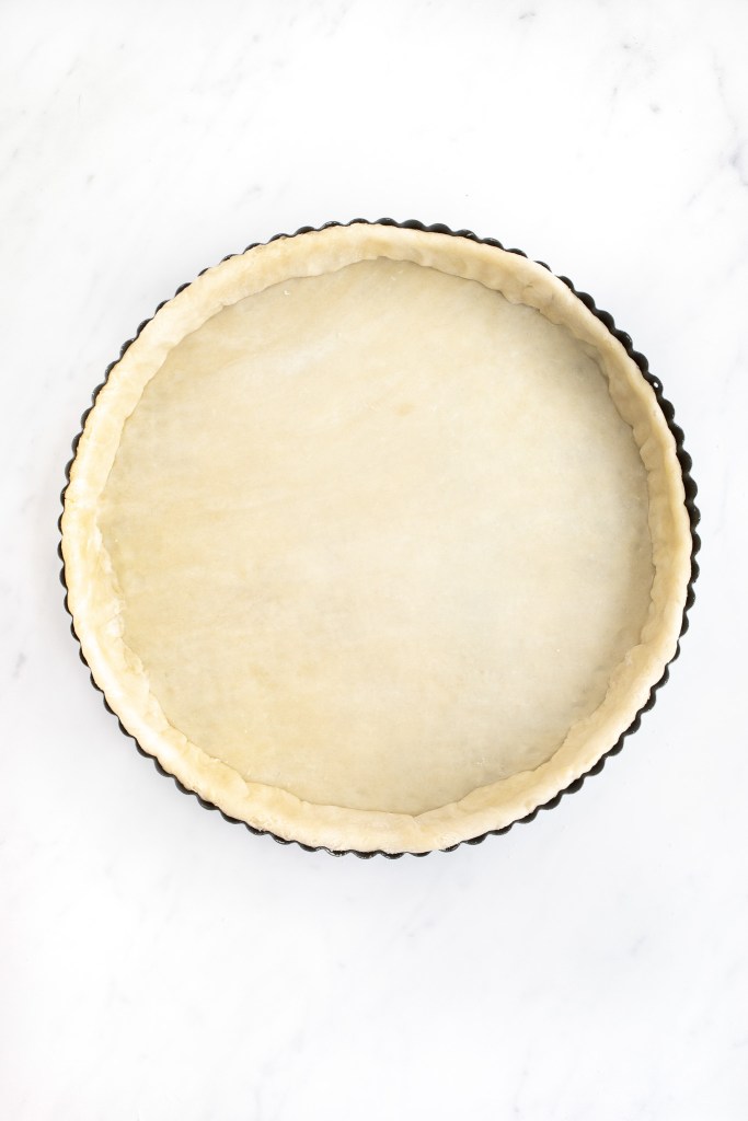 - Carefully transfer rolled-out dough onto 10" tart pan and gently press into bottom edges of pan. Cut off any excess dough, leaving 1" to 1½" of excess dough around the circumference of pan.