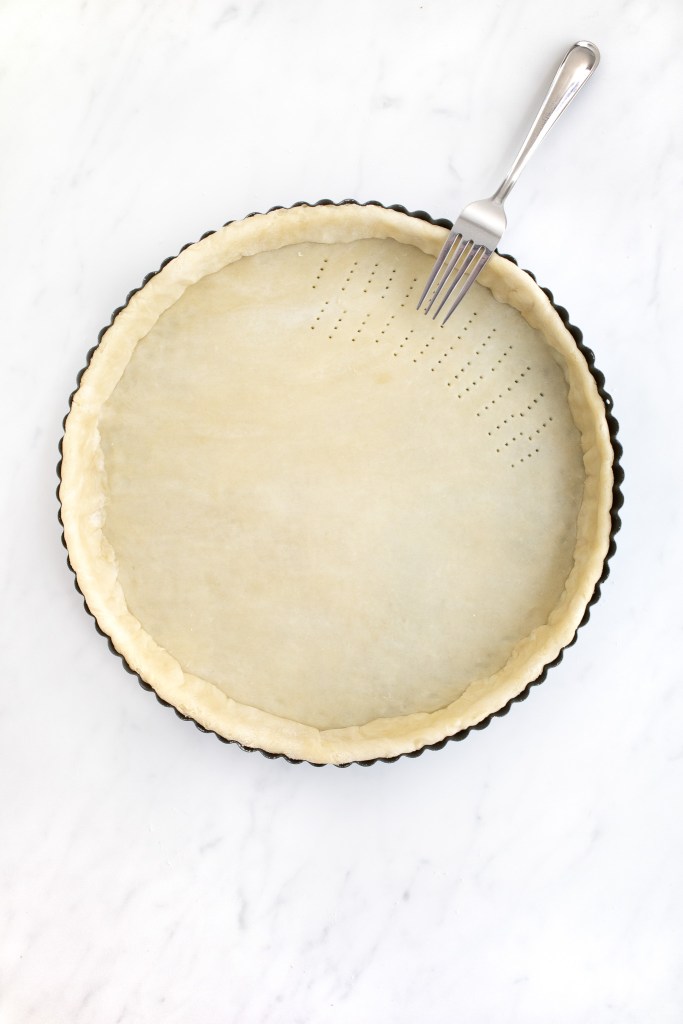 Press very gently to push the dough into the sides of the tart pan. With a fork, prick the bottom layer of the pastry dough inside the pan.