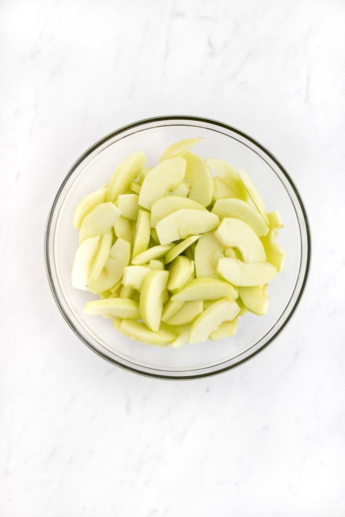 - Peel, core, and slice the apples to approximately ¼” thickness. Place sliced apples in a bowl with lemon juice to prevent browning.4–6 Granny Smith apples2–3 Tbsp lemon juice