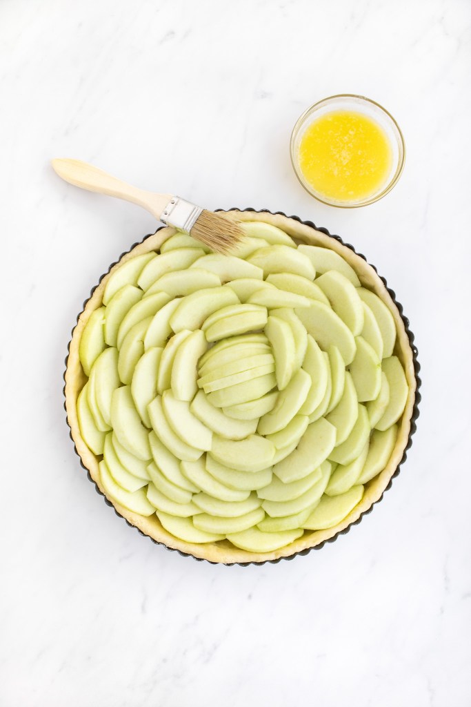Making a French apple tart can be intimidating, but I promise there is nothing to be afraid of. Though arranging the apple slices to create a perfect circular pattern may trigger those of us with even the mildest of perfectionistic tendencies, you don’t have to spend a lot of time on it and it doesn’t have to be perfect. In fact, spending too much time arranging the apple slices may lead to your dough becoming a warm, soft, sticky mess. One way around this is to make the tart in a square shape, on a sheet pan, arranging the apples in rows — it’s much simpler, faster, and no less elegant (or delicious)!