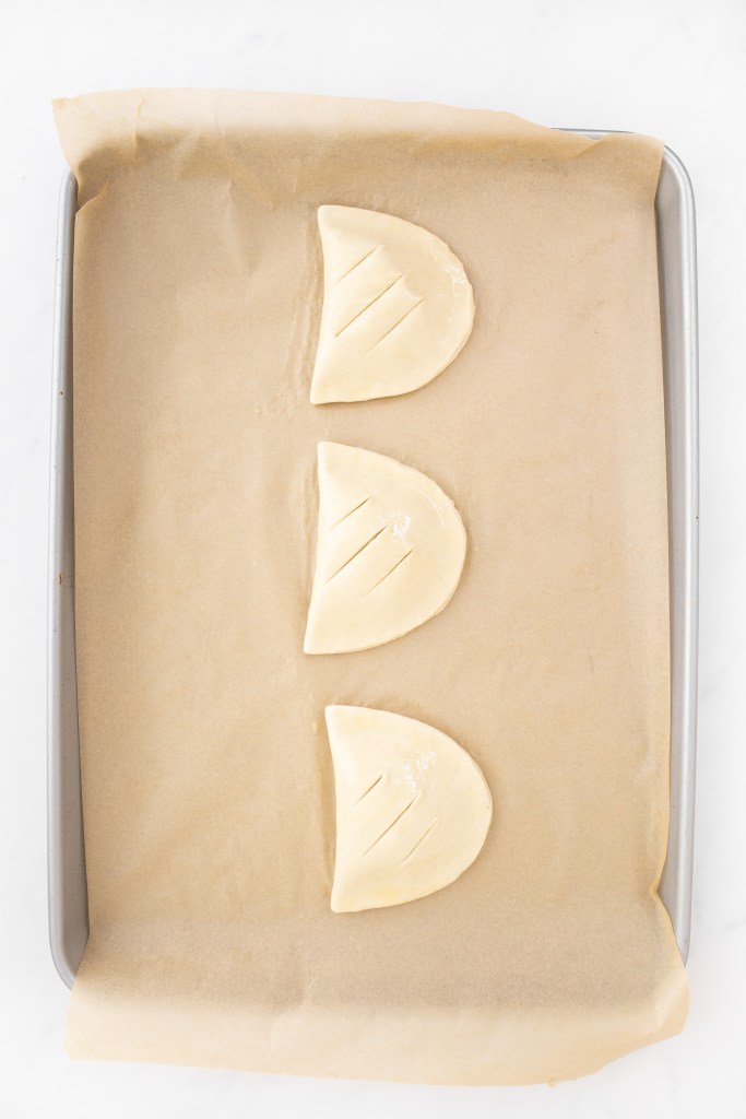 Then, with a pastry brush, brush the top and sides of the turnover with the remaining egg wash. Score the top of each turnover to allow steam to escape during the baking process.