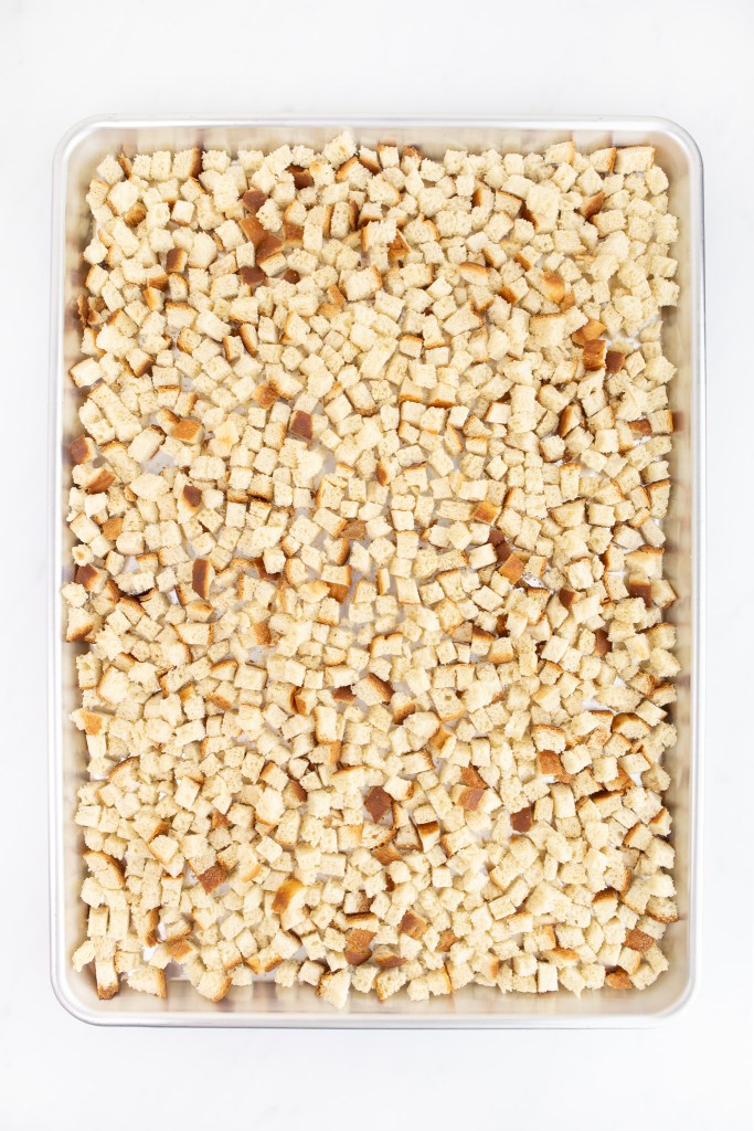 - Cut bread into ½” cubes and place them in a single layer on a baking sheet. Bake in the top part of the oven for 60 minutes, stirring every 20 minutes until dry and crisp. Allow to cool completely before placing them into a very large bowl.1 lb white sandwich bread, ½" cubed