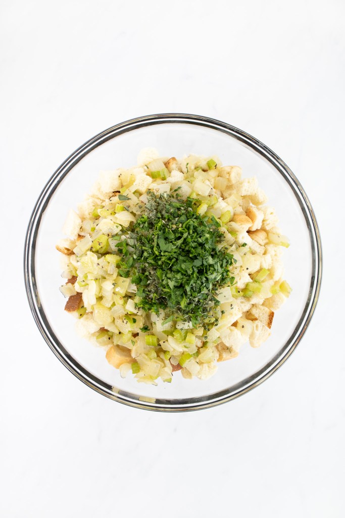 To the large bowl of bread cubes, add in the cooked veggies, the fresh herbs, and the dried cranberries. Stir to combine.