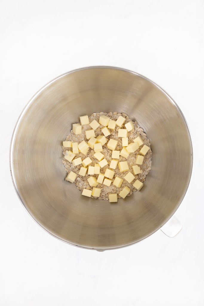 - In the bowl of a stand mixer fitted with the paddle attachment, on low speed, mix flour, brown sugar, white sugar, and salt. Add in oats and continue mixing until well combined.¾ cup all-purpose flour1 cup oats⅓ cup granulated sugar⅓ cup light brown sugar, packed¼ tsp kosher salt
