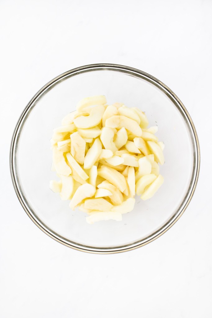 Place the apple slices into the bowl with the lemon juice, stirring them occasionally. This helps prevent the apples from browning while finishing this step.