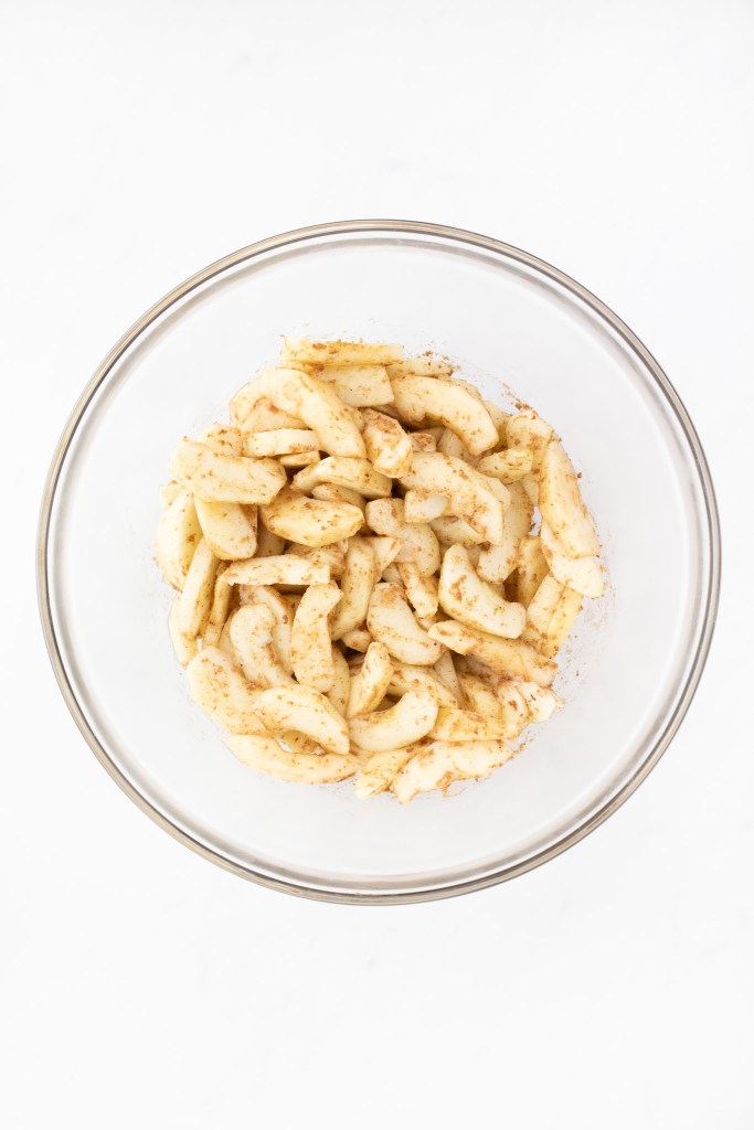 Pour the melted butter into the bowl and stir. Finally, add in the sugar, flour, cinnamon, and nutmeg. Stir until the apples are all evenly coated.