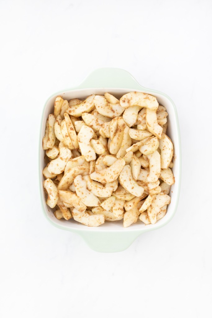 To assemble the apple crisp, pour the apple filling into an 8” square pan or casserole dish.