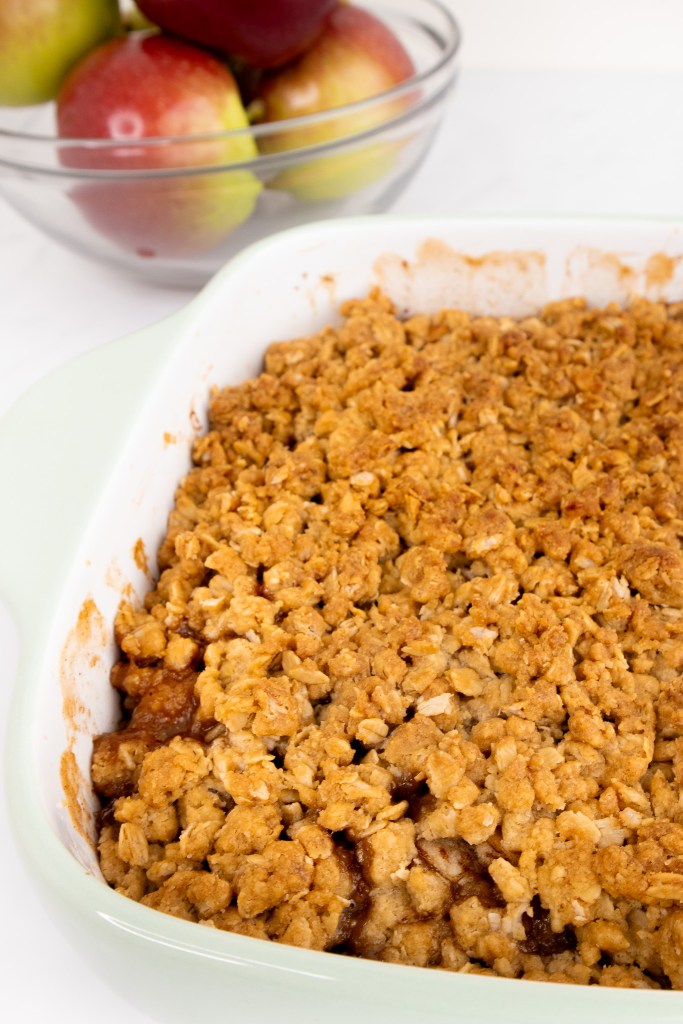 This recipe is perfect for an 8” square pan or casserole dish. You could very easily get away with using a 9″ square pan or dish (just by adding a few more apples), but any larger than that and I would multiply the recipe by 1.5 or 2 (depending on the size of your baking dish and how many mouths you are feeding).
