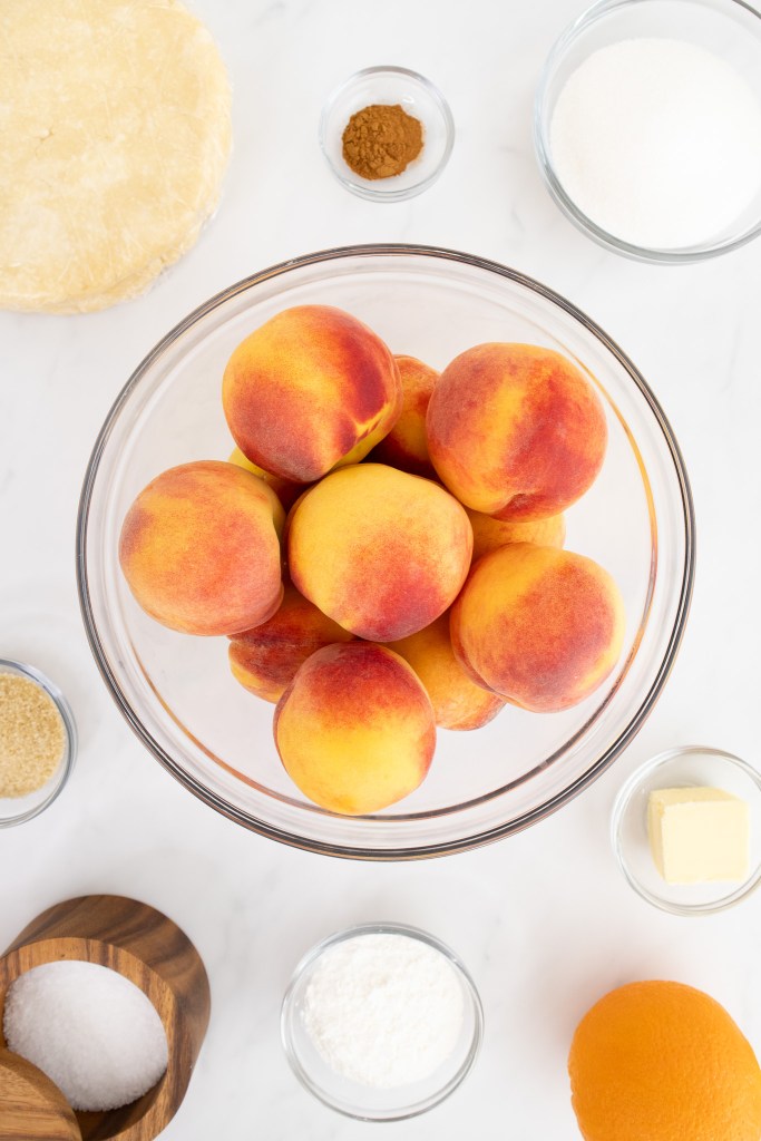 - Off heat, whisk in orange juice, orange zest, cinnamon, and salt. Add in chilled butter and swirl it around until fully melted and combined. Whisk in cornstarch until no lumps remain. Set peach liquid mixture aside while rolling out the pie crust. (Do not add liquid back to peach wedges just yet!)2 Tbsp freshly squeezed orange juice½ tsp orange zest1 tsp ground cinnamon¼ tsp kosher salt2 Tbsp unsalted butter¼ cup cornstarch