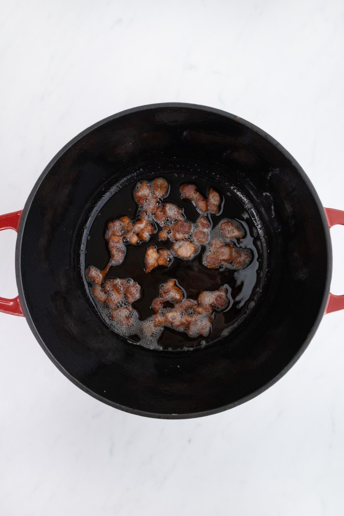 - Heat olive oil in a large pot or Dutch oven over moderate heat. Cook bacon until it is crisp and fat has rendered (about 10 minutes). With a slotted spoon, remove bacon while leaving fat in pot. Set cooked bacon aside.3 strips bacon, cut into ½" pieces1 Tbsp extra virgin olive oil