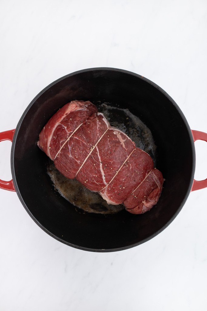 Next, cook the beef roast in the rendered baking fat for about 3 to 5 minutes per side, until it is nicely browned on all sides. I find it easiest to rotate the meat using a large pair of tongs. Once browned, remove the roast from the pot and set aside on a plate.