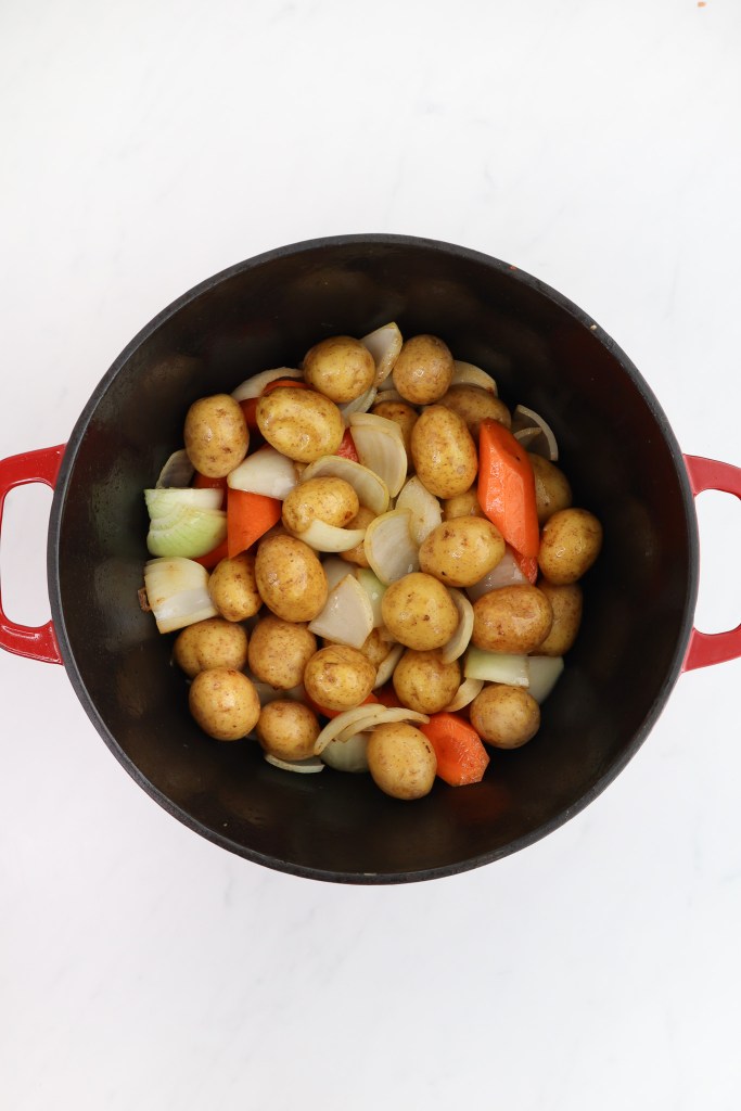 - Add in butter and heat until foaming subsides. Add in chopped carrots, quartered onions, and potatoes. Season with salt and pepper. Brown vegetables for 10 minutes.2 Tbsp unsalted butter3 medium carrots, washed, peeled, and roughly chopped into thirds2 medium onions, peeled and quartered1.5 lbs (680g) small yellow potatoes, washed1 tsp kosher salt½ tsp ground black pepper