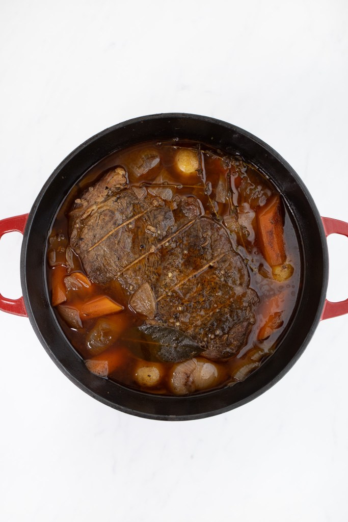 If you choose to leave out the alcohol, you can replace both the wine and/or cognac with an equal amount of beef stock — preferably homemade, which will improve the pot roast’s depth of flavor (click for my Homemade Beef Stock recipe).