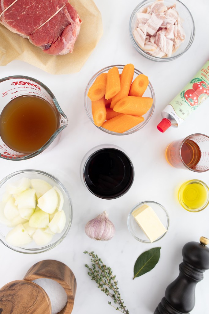 Next, add in the cooked bacon and the browned roast. Add in the tomato paste, red wine, minced garlic, fresh thyme, bay leaf, and enough beef stock so that the beef is at least 2/3 covered.