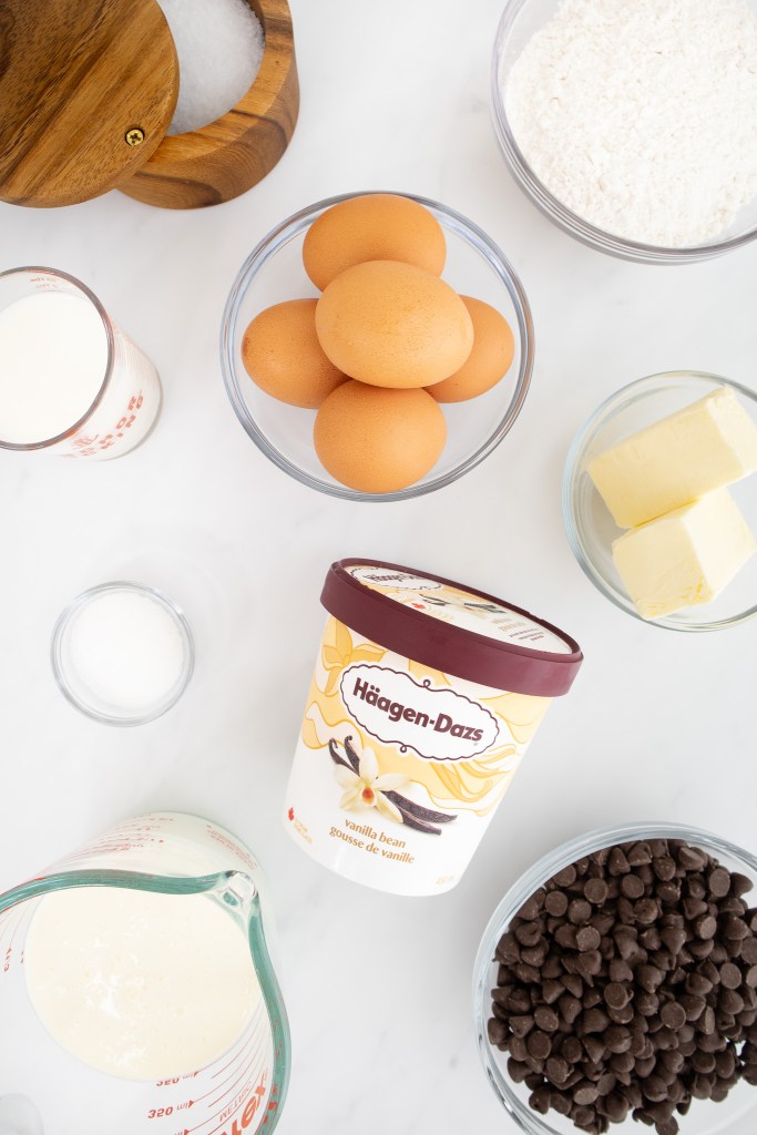 - When ready to serve, cut each profiterole in half. Using a small cookie, scoop a small amount of ice cream into the center of each.Good-quality ice cream