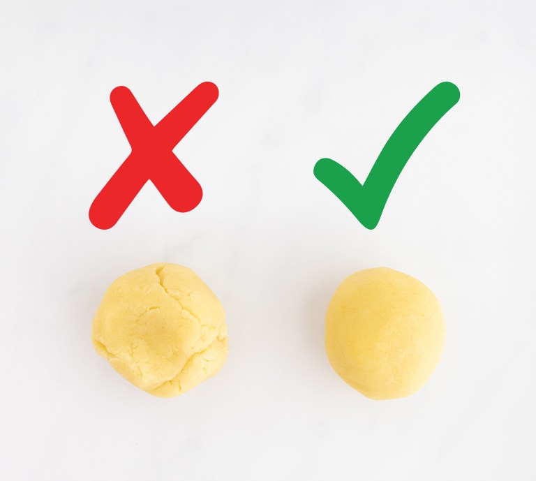 - To test the dough, remove a small portion and roll it into a ball with your hands. If the dough is dry and cracked, add in a Tbsp of milk (or water) and mix just until combined. If the dough is very sticky, sprinkle in an additional Tbsp of flour. (The goal is to be able to roll the dough into smooth balls that don’t show any cracking.)