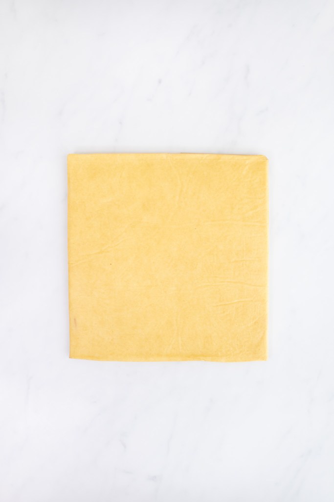 - Place the butter into the center of the traced-out square and fold all four sides of the parchment paper up over the butter. Using the rolling pin, continue to roll out and form the butter into a square, pressing the butter into the corners with your fingers. With a cutting board (or any heavy flat object), press down on the butter block to ensure uniform thickness.