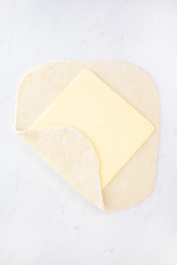 Remove the beurrage (butter block) from the fridge and place in the center of the dough, rotated at a 45-degree angle, like a diamond in a square.