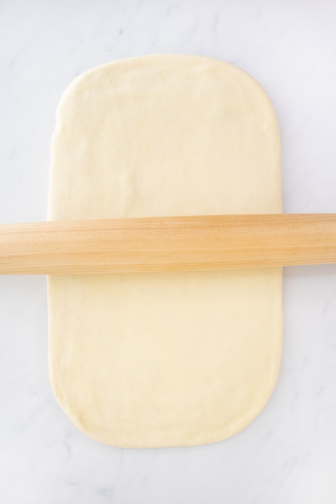 Roll the dough out into a rectangle at least twice as long as it is wide (about 20” by 10”), maintaining a rectangular shape as much as possible.
