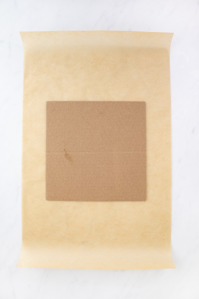 - Prepare a piece of parchment paper about 18" long. In the center, trace an 8" square. (Tracing around a cut-out 8" piece of cardboard works well.)