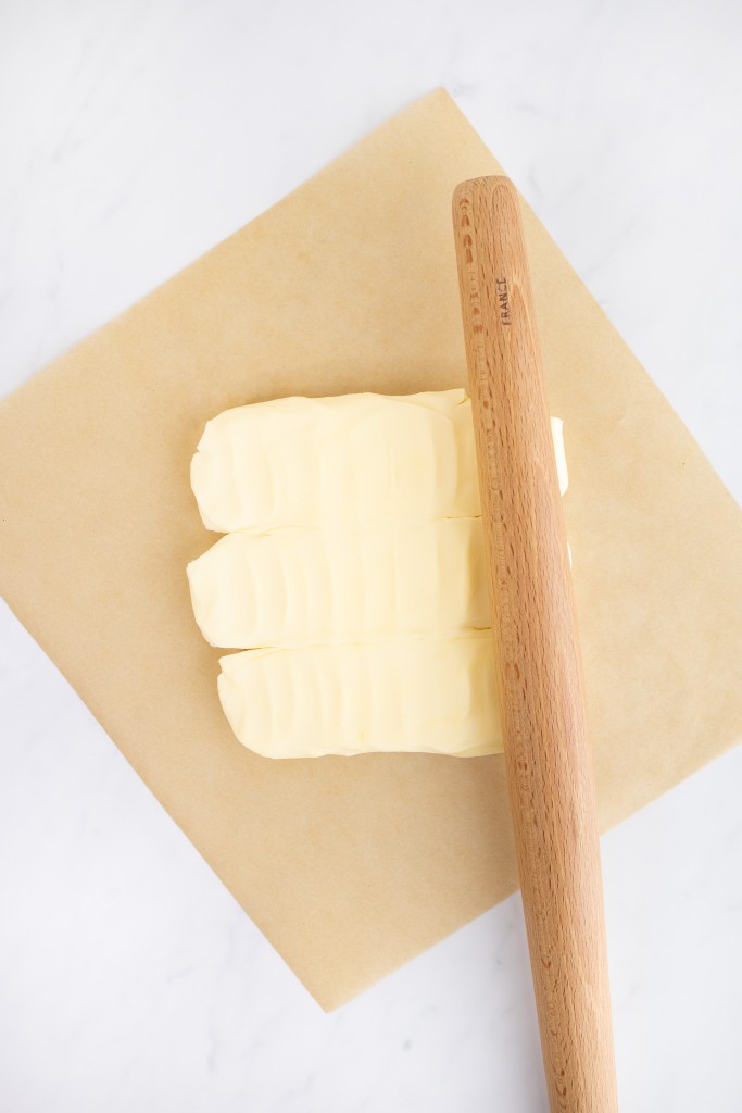 - With a rolling pin, whack the chilled butter until it is malleable and spreadable, but still cold.24 Tbsp (3 sticks) unsalted butter, chilled