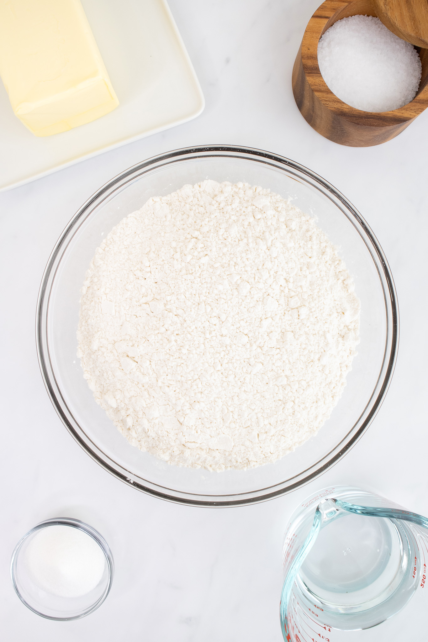 - In the bowl of a stand mixer fitted with the paddle attachment, sift together flour, sugar, and salt. Mix on low speed until combined (about 30 seconds).3 ½ cups all-purpose flour2 Tbsp granulated sugar1 ½ tsp kosher salt