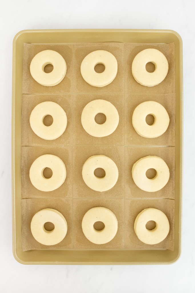 - Place one donut on each square of parchment paper (on the prepared baking sheet). Then, set the baking sheet into the oven — which should still be turned off!