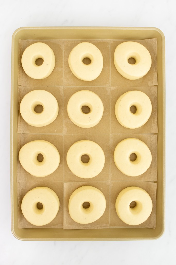 For this recipe, I find the best way to tell if the donuts are properly proofed is by their appearance: they should be roughly double in size and look puffy and light. You can also gently press the surface of the dough with your finger. The dough should slowly spring back and leave a small indent. If the dough springs back very quickly, the donuts are under-proofed and need more time. If it doesn’t spring back at all, they may be over-proofed. That said, I do find the finger test a bit tricky with such a soft, pillowy dough.