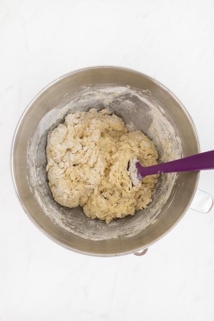 Pour your liquid mixture and yeast mixture into the bowl of your stand mixer (with the flour, salt, and nutmeg), and stir to combine with a rubber spatula until there are no large patches of flour. This will give your dough hook a head start!